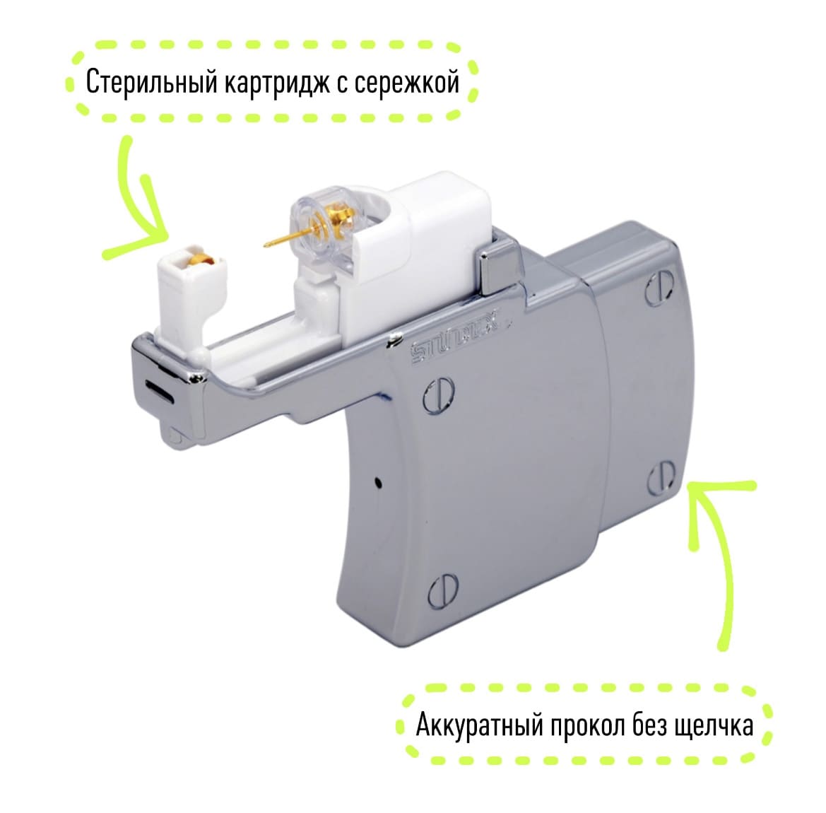 Гарантия стерильности Каждая серёжка находится в индивидуальном одноразовом стерильном картридже - никаких контактов с руками или инструментами