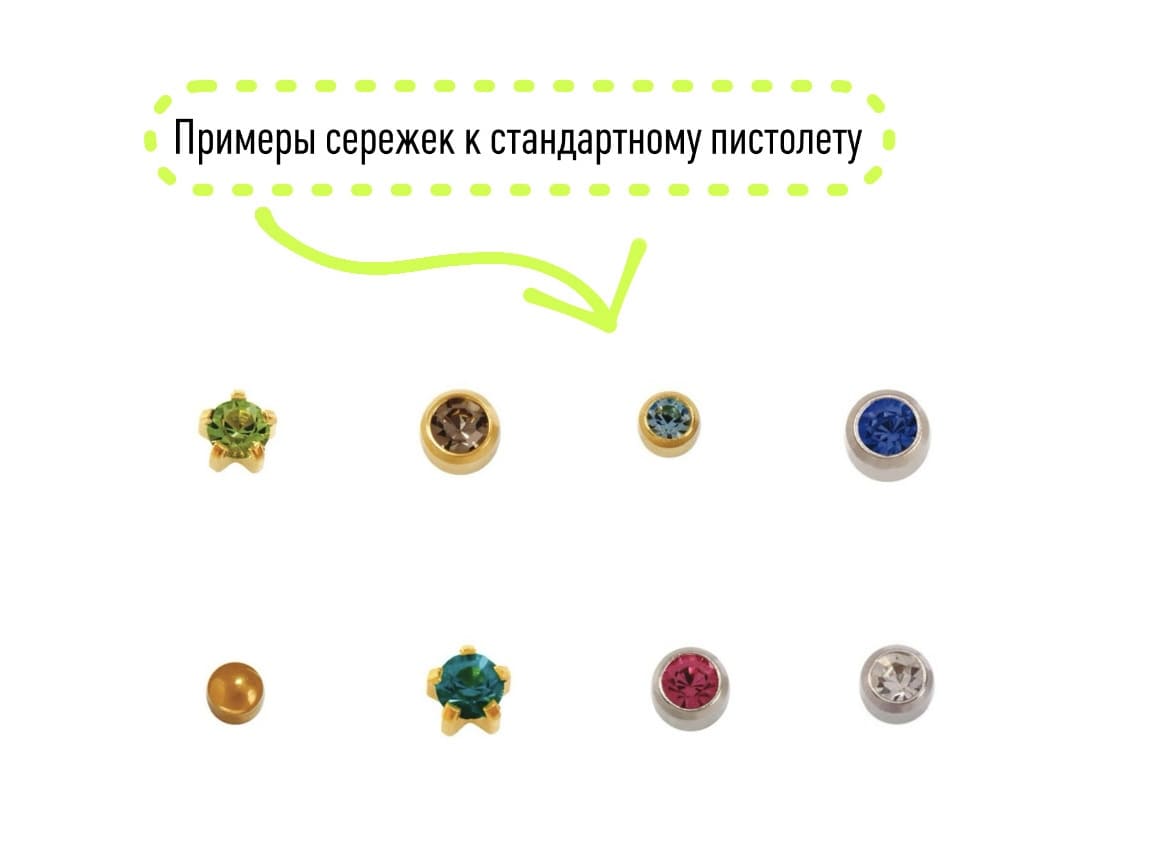 Стоимость прокола стандартным пистолетом 2000 рублей, так как сережки отличаются только цветом камня.
